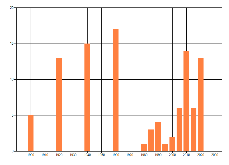 Het aantal atlasblokken (5x5 km) waarin de soort is gemeld binnen een periode van vijf jaar (vanaf 1980) of twintig jaar. Niet gecorrigeerd voor waarnemersinspanning en het aantal doorgegeven waarnemingen kan sterk variëren per periode, dus een trend in verspreiding kan hier niet direct uit worden afgelezen. Het opgegeven jaartal is het eerste jaar van de periode. Bron: gevalideerde waarnemingen uit de NDFF.