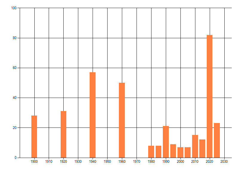 Het aantal atlasblokken (5x5 km) waarin de soort is gemeld binnen een periode van vijf jaar (vanaf 1980) of twintig jaar. Niet gecorrigeerd voor waarnemersinspanning en het aantal doorgegeven waarnemingen kan sterk variëren per periode, dus een trend in verspreiding kan hier niet direct uit worden afgelezen. Het opgegeven jaartal is het eerste jaar van de periode. Bron: gevalideerde waarnemingen uit de NDFF.