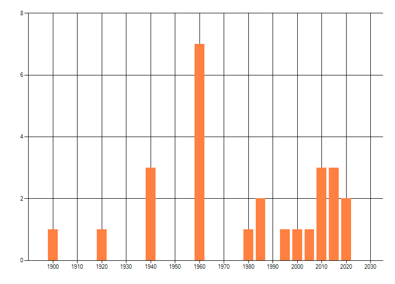 Het aantal atlasblokken (5x5 km) waarin de soort is gemeld binnen een periode van vijf jaar (vanaf 1980) of twintig jaar. Niet gecorrigeerd voor waarnemersinspanning en het aantal doorgegeven waarnemingen kan sterk variëren per periode, dus een trend in verspreiding kan hier niet direct uit worden afgelezen. Het opgegeven jaartal is het eerste jaar van de periode. Bron: gevalideerde waarnemingen uit de NDFF.