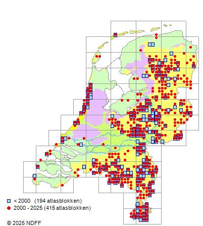 Het aantal atlasblokken (5x5 km) waarin de soort is gemeld binnen een periode van vijf jaar (vanaf 1980) of twintig jaar. Niet gecorrigeerd voor waarnemersinspanning en het aantal doorgegeven waarnemingen kan sterk variëren per periode, dus een trend in verspreiding kan hier niet direct uit worden afgelezen. Het opgegeven jaartal is het eerste jaar van de periode. Bron: gevalideerde waarnemingen uit de NDFF.