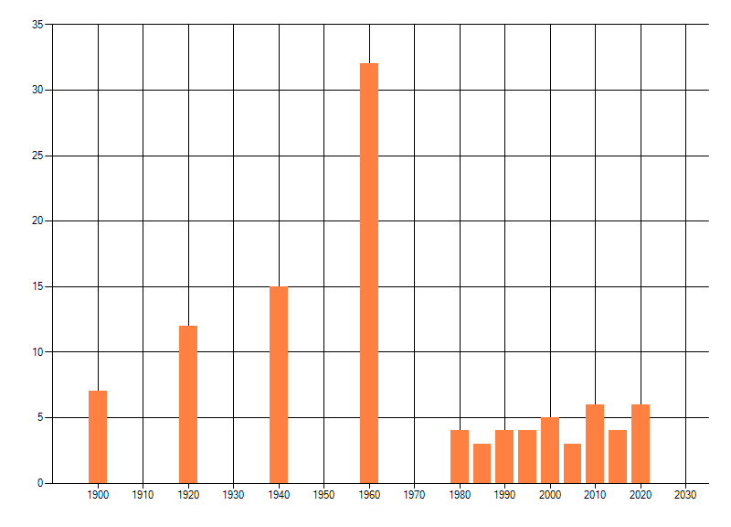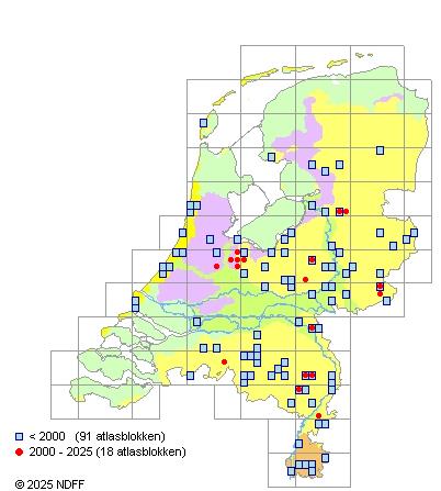 Het aantal atlasblokken (5x5 km) waarin de soort is gemeld binnen een periode van vijf jaar (vanaf 1980) of twintig jaar. Niet gecorrigeerd voor waarnemersinspanning en het aantal doorgegeven waarnemingen kan sterk variëren per periode, dus een trend in verspreiding kan hier niet direct uit worden afgelezen. Het opgegeven jaartal is het eerste jaar van de periode. Bron: gevalideerde waarnemingen uit de NDFF.