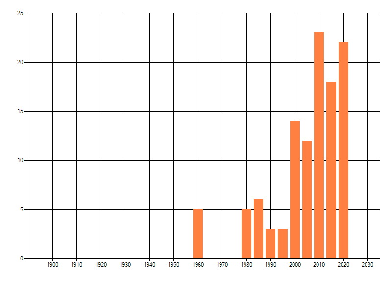 Het aantal atlasblokken (5x5 km) waarin de soort is gemeld binnen een periode van vijf jaar (vanaf 1980) of twintig jaar. Niet gecorrigeerd voor waarnemersinspanning en het aantal doorgegeven waarnemingen kan sterk variëren per periode, dus een trend in verspreiding kan hier niet direct uit worden afgelezen. Het opgegeven jaartal is het eerste jaar van de periode. Bron: gevalideerde waarnemingen uit de NDFF.