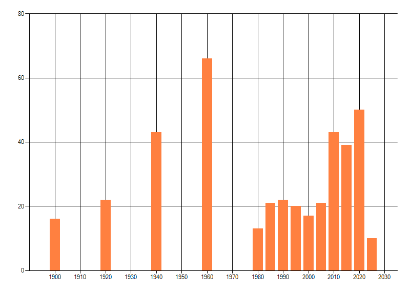 Het aantal atlasblokken (5x5 km) waarin de soort is gemeld binnen een periode van vijf jaar (vanaf 1980) of twintig jaar. Niet gecorrigeerd voor waarnemersinspanning en het aantal doorgegeven waarnemingen kan sterk variëren per periode, dus een trend in verspreiding kan hier niet direct uit worden afgelezen. Het opgegeven jaartal is het eerste jaar van de periode. Bron: gevalideerde waarnemingen uit de NDFF.