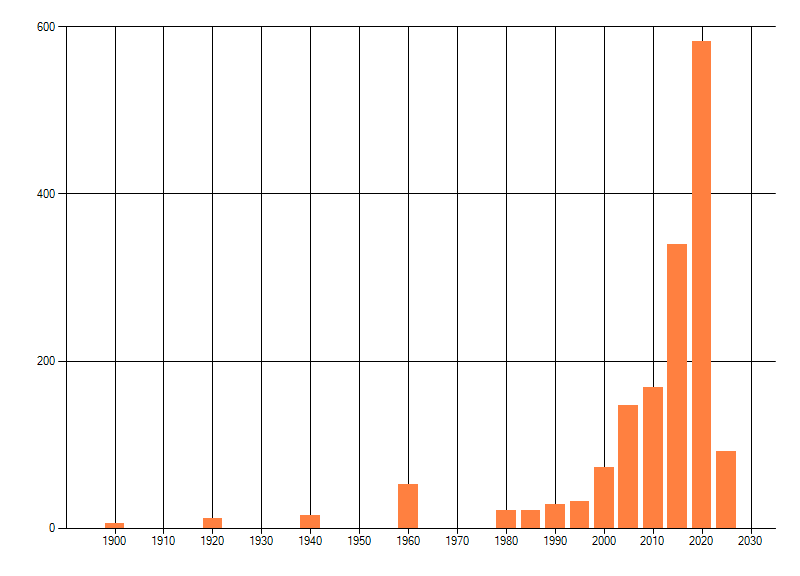 Het aantal atlasblokken (5x5 km) waarin de soort is gemeld binnen een periode van vijf jaar (vanaf 1980) of twintig jaar. Niet gecorrigeerd voor waarnemersinspanning en het aantal doorgegeven waarnemingen kan sterk variëren per periode, dus een trend in verspreiding kan hier niet direct uit worden afgelezen. Het opgegeven jaartal is het eerste jaar van de periode. Bron: gevalideerde waarnemingen uit de NDFF.