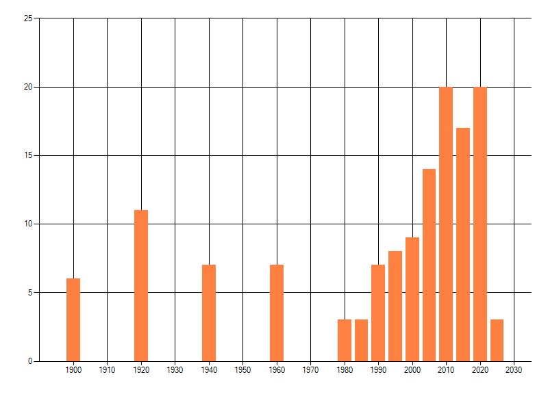 Het aantal atlasblokken (5x5 km) waarin de soort is gemeld binnen een periode van vijf jaar (vanaf 1980) of twintig jaar. Niet gecorrigeerd voor waarnemersinspanning en het aantal doorgegeven waarnemingen kan sterk variëren per periode, dus een trend in verspreiding kan hier niet direct uit worden afgelezen. Het opgegeven jaartal is het eerste jaar van de periode. Bron: gevalideerde waarnemingen uit de NDFF.