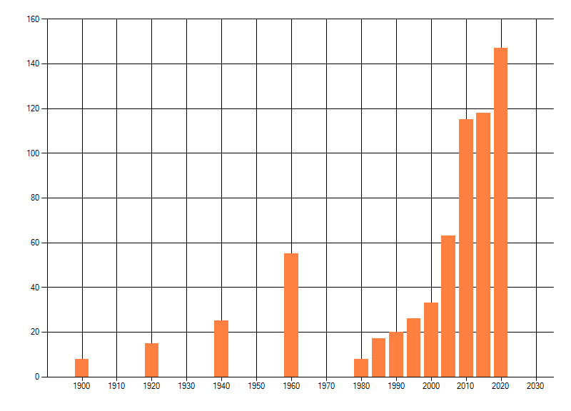 Het aantal atlasblokken (5x5 km) waarin de soort is gemeld binnen een periode van vijf jaar (vanaf 1980) of twintig jaar. Niet gecorrigeerd voor waarnemersinspanning en het aantal doorgegeven waarnemingen kan sterk variëren per periode, dus een trend in verspreiding kan hier niet direct uit worden afgelezen. Het opgegeven jaartal is het eerste jaar van de periode. Bron: gevalideerde waarnemingen uit de NDFF.