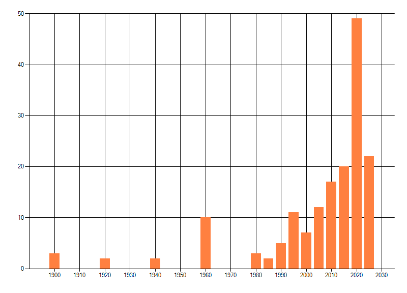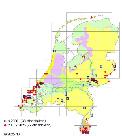 Het aantal atlasblokken (5x5 km) waarin de soort is gemeld binnen een periode van vijf jaar (vanaf 1980) of twintig jaar. Niet gecorrigeerd voor waarnemersinspanning en het aantal doorgegeven waarnemingen kan sterk variëren per periode, dus een trend in verspreiding kan hier niet direct uit worden afgelezen. Het opgegeven jaartal is het eerste jaar van de periode. Bron: gevalideerde waarnemingen uit de NDFF.