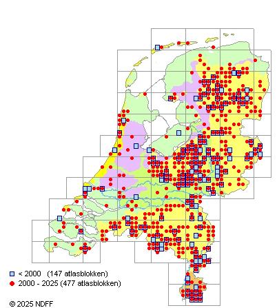 Het aantal atlasblokken (5x5 km) waarin de soort is gemeld binnen een periode van vijf jaar (vanaf 1980) of twintig jaar. Niet gecorrigeerd voor waarnemersinspanning en het aantal doorgegeven waarnemingen kan sterk variëren per periode, dus een trend in verspreiding kan hier niet direct uit worden afgelezen. Het opgegeven jaartal is het eerste jaar van de periode. Bron: gevalideerde waarnemingen uit de NDFF.