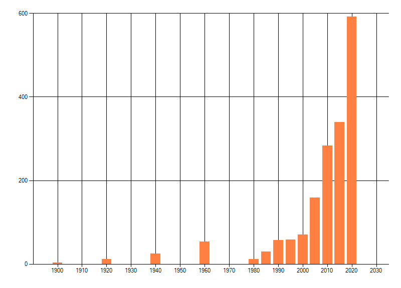 Het aantal atlasblokken (5x5 km) waarin de soort is gemeld binnen een periode van vijf jaar (vanaf 1980) of twintig jaar. Niet gecorrigeerd voor waarnemersinspanning en het aantal doorgegeven waarnemingen kan sterk variëren per periode, dus een trend in verspreiding kan hier niet direct uit worden afgelezen. Het opgegeven jaartal is het eerste jaar van de periode. Bron: gevalideerde waarnemingen uit de NDFF.