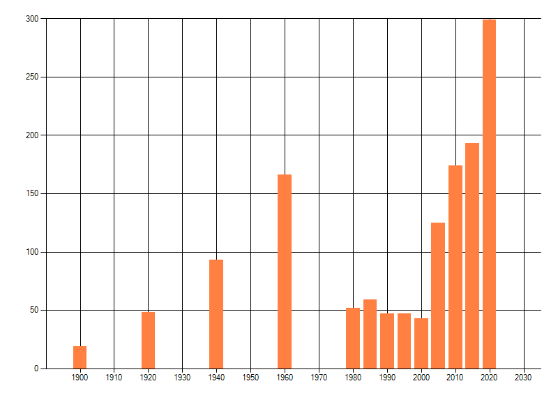 Het aantal atlasblokken (5x5 km) waarin de soort is gemeld binnen een periode van vijf jaar (vanaf 1980) of twintig jaar. Niet gecorrigeerd voor waarnemersinspanning en het aantal doorgegeven waarnemingen kan sterk variëren per periode, dus een trend in verspreiding kan hier niet direct uit worden afgelezen. Het opgegeven jaartal is het eerste jaar van de periode. Bron: gevalideerde waarnemingen uit de NDFF.