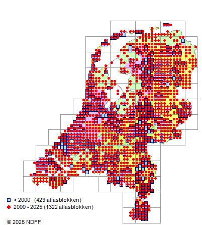 Het aantal atlasblokken (5x5 km) waarin de soort is gemeld binnen een periode van vijf jaar (vanaf 1980) of twintig jaar. Niet gecorrigeerd voor waarnemersinspanning en het aantal doorgegeven waarnemingen kan sterk variëren per periode, dus een trend in verspreiding kan hier niet direct uit worden afgelezen. Het opgegeven jaartal is het eerste jaar van de periode. Bron: gevalideerde waarnemingen uit de NDFF.
