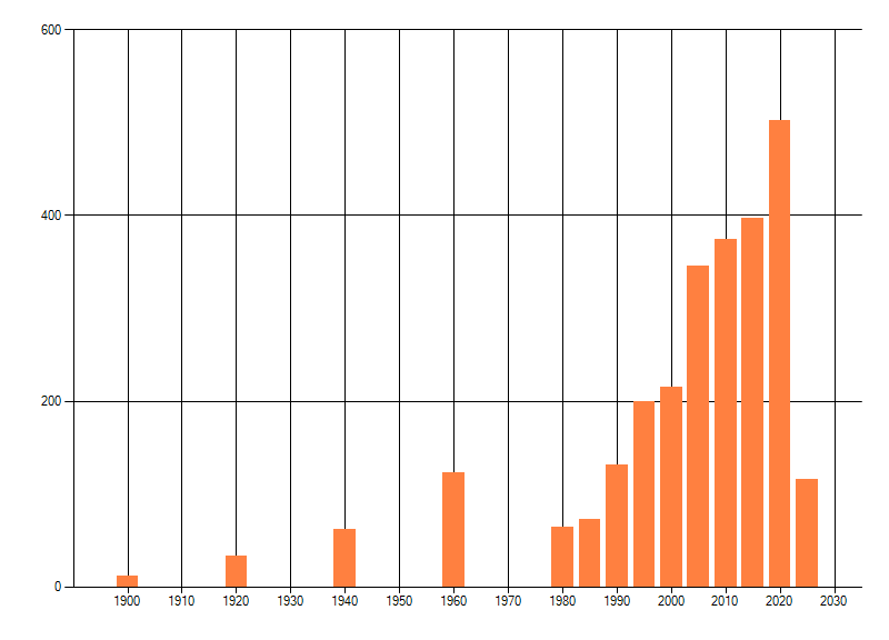 Het aantal atlasblokken (5x5 km) waarin de soort is gemeld binnen een periode van vijf jaar (vanaf 1980) of twintig jaar. Niet gecorrigeerd voor waarnemersinspanning en het aantal doorgegeven waarnemingen kan sterk variëren per periode, dus een trend in verspreiding kan hier niet direct uit worden afgelezen. Het opgegeven jaartal is het eerste jaar van de periode. Bron: gevalideerde waarnemingen uit de NDFF.