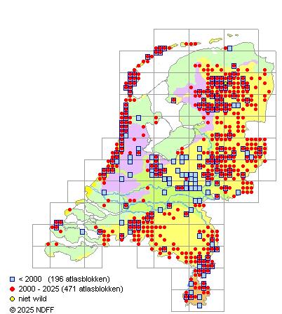 Het aantal atlasblokken (5x5 km) waarin de soort is gemeld binnen een periode van vijf jaar (vanaf 1980) of twintig jaar. Niet gecorrigeerd voor waarnemersinspanning en het aantal doorgegeven waarnemingen kan sterk variëren per periode, dus een trend in verspreiding kan hier niet direct uit worden afgelezen. Het opgegeven jaartal is het eerste jaar van de periode. Bron: gevalideerde waarnemingen uit de NDFF.