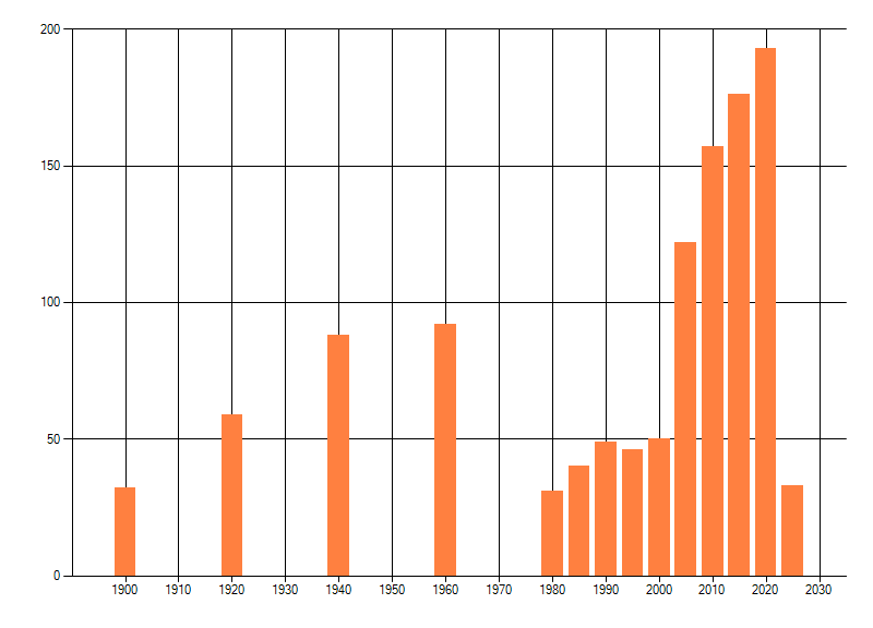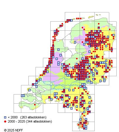 Het aantal atlasblokken (5x5 km) waarin de soort is gemeld binnen een periode van vijf jaar (vanaf 1980) of twintig jaar. Niet gecorrigeerd voor waarnemersinspanning en het aantal doorgegeven waarnemingen kan sterk variëren per periode, dus een trend in verspreiding kan hier niet direct uit worden afgelezen. Het opgegeven jaartal is het eerste jaar van de periode. Bron: gevalideerde waarnemingen uit de NDFF.
