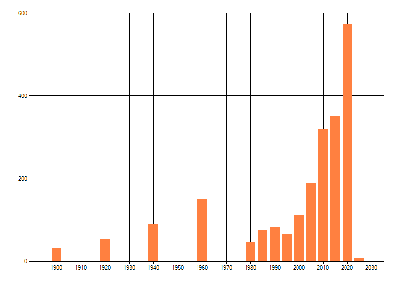 Het aantal atlasblokken (5x5 km) waarin de soort is gemeld binnen een periode van vijf jaar (vanaf 1980) of twintig jaar. Niet gecorrigeerd voor waarnemersinspanning en het aantal doorgegeven waarnemingen kan sterk variëren per periode, dus een trend in verspreiding kan hier niet direct uit worden afgelezen. Het opgegeven jaartal is het eerste jaar van de periode. Bron: gevalideerde waarnemingen uit de NDFF.