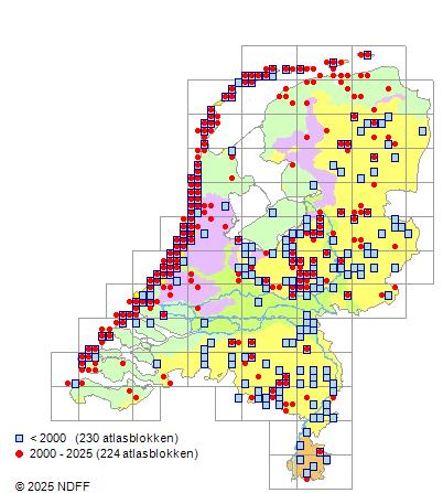 Het aantal atlasblokken (5x5 km) waarin de soort is gemeld binnen een periode van vijf jaar (vanaf 1980) of twintig jaar. Niet gecorrigeerd voor waarnemersinspanning en het aantal doorgegeven waarnemingen kan sterk variëren per periode, dus een trend in verspreiding kan hier niet direct uit worden afgelezen. Het opgegeven jaartal is het eerste jaar van de periode. Bron: gevalideerde waarnemingen uit de NDFF.