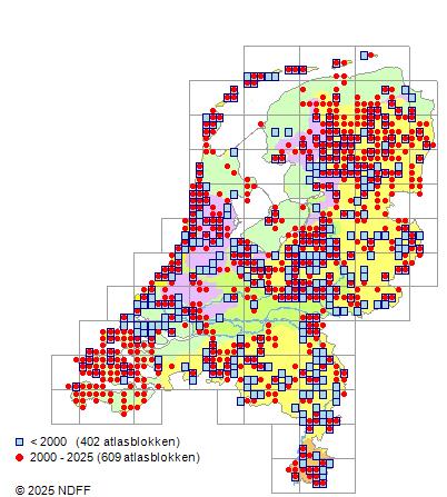 Het aantal atlasblokken (5x5 km) waarin de soort is gemeld binnen een periode van vijf jaar (vanaf 1980) of twintig jaar. Niet gecorrigeerd voor waarnemersinspanning en het aantal doorgegeven waarnemingen kan sterk variëren per periode, dus een trend in verspreiding kan hier niet direct uit worden afgelezen. Het opgegeven jaartal is het eerste jaar van de periode. Bron: gevalideerde waarnemingen uit de NDFF.