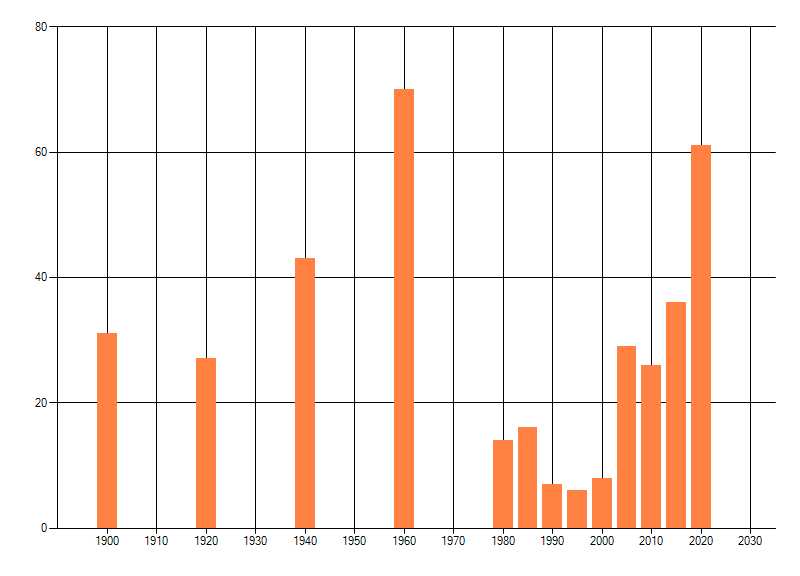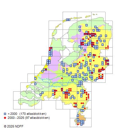Het aantal atlasblokken (5x5 km) waarin de soort is gemeld binnen een periode van vijf jaar (vanaf 1980) of twintig jaar. Niet gecorrigeerd voor waarnemersinspanning en het aantal doorgegeven waarnemingen kan sterk variëren per periode, dus een trend in verspreiding kan hier niet direct uit worden afgelezen. Het opgegeven jaartal is het eerste jaar van de periode. Bron: gevalideerde waarnemingen uit de NDFF.