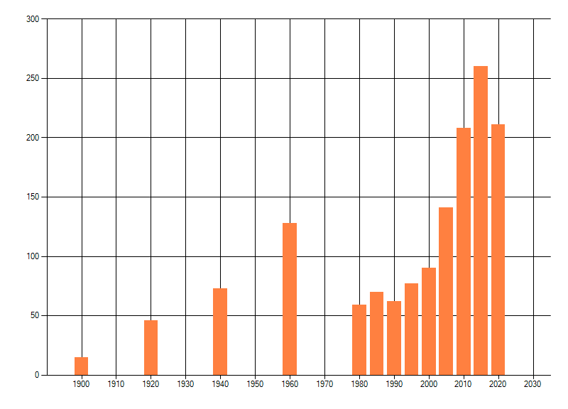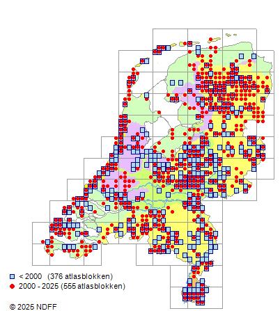 Het aantal atlasblokken (5x5 km) waarin de soort is gemeld binnen een periode van vijf jaar (vanaf 1980) of twintig jaar. Niet gecorrigeerd voor waarnemersinspanning en het aantal doorgegeven waarnemingen kan sterk variëren per periode, dus een trend in verspreiding kan hier niet direct uit worden afgelezen. Het opgegeven jaartal is het eerste jaar van de periode. Bron: gevalideerde waarnemingen uit de NDFF.