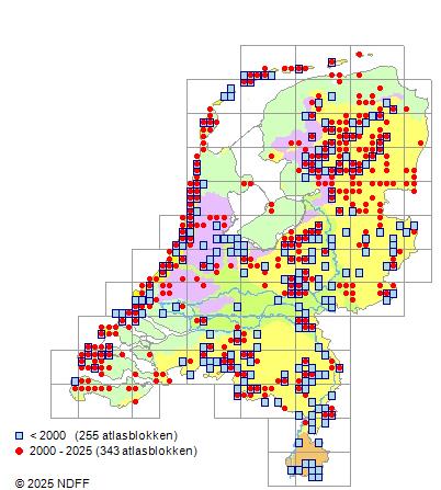 Het aantal atlasblokken (5x5 km) waarin de soort is gemeld binnen een periode van vijf jaar (vanaf 1980) of twintig jaar. Niet gecorrigeerd voor waarnemersinspanning en het aantal doorgegeven waarnemingen kan sterk variëren per periode, dus een trend in verspreiding kan hier niet direct uit worden afgelezen. Het opgegeven jaartal is het eerste jaar van de periode. Bron: gevalideerde waarnemingen uit de NDFF.