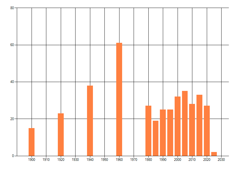 Het aantal atlasblokken (5x5 km) waarin de soort is gemeld binnen een periode van vijf jaar (vanaf 1980) of twintig jaar. Niet gecorrigeerd voor waarnemersinspanning en het aantal doorgegeven waarnemingen kan sterk variëren per periode, dus een trend in verspreiding kan hier niet direct uit worden afgelezen. Het opgegeven jaartal is het eerste jaar van de periode. Bron: gevalideerde waarnemingen uit de NDFF.