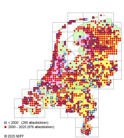 Het aantal atlasblokken (5x5 km) waarin de soort is gemeld binnen een periode van vijf jaar (vanaf 1980) of twintig jaar. Niet gecorrigeerd voor waarnemersinspanning en het aantal doorgegeven waarnemingen kan sterk variëren per periode, dus een trend in verspreiding kan hier niet direct uit worden afgelezen. Het opgegeven jaartal is het eerste jaar van de periode. Bron: gevalideerde waarnemingen uit de NDFF.