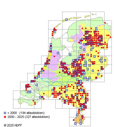 Het aantal atlasblokken (5x5 km) waarin de soort is gemeld binnen een periode van vijf jaar (vanaf 1980) of twintig jaar. Niet gecorrigeerd voor waarnemersinspanning en het aantal doorgegeven waarnemingen kan sterk variëren per periode, dus een trend in verspreiding kan hier niet direct uit worden afgelezen. Het opgegeven jaartal is het eerste jaar van de periode. Bron: gevalideerde waarnemingen uit de NDFF.