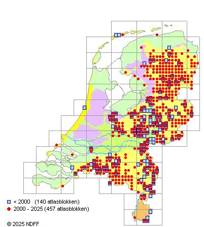 Het aantal atlasblokken (5x5 km) waarin de soort is gemeld binnen een periode van vijf jaar (vanaf 1980) of twintig jaar. Niet gecorrigeerd voor waarnemersinspanning en het aantal doorgegeven waarnemingen kan sterk variëren per periode, dus een trend in verspreiding kan hier niet direct uit worden afgelezen. Het opgegeven jaartal is het eerste jaar van de periode. Bron: gevalideerde waarnemingen uit de NDFF.