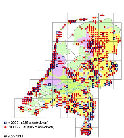Het aantal atlasblokken (5x5 km) waarin de soort is gemeld binnen een periode van vijf jaar (vanaf 1980) of twintig jaar. Niet gecorrigeerd voor waarnemersinspanning en het aantal doorgegeven waarnemingen kan sterk variëren per periode, dus een trend in verspreiding kan hier niet direct uit worden afgelezen. Het opgegeven jaartal is het eerste jaar van de periode. Bron: gevalideerde waarnemingen uit de NDFF.