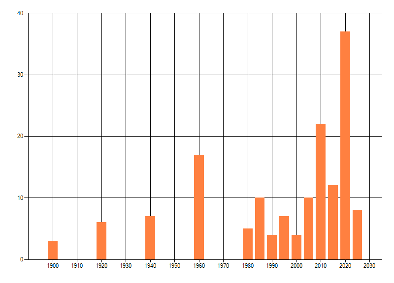 Het aantal atlasblokken (5x5 km) waarin de soort is gemeld binnen een periode van vijf jaar (vanaf 1980) of twintig jaar. Niet gecorrigeerd voor waarnemersinspanning en het aantal doorgegeven waarnemingen kan sterk variëren per periode, dus een trend in verspreiding kan hier niet direct uit worden afgelezen. Het opgegeven jaartal is het eerste jaar van de periode. Bron: gevalideerde waarnemingen uit de NDFF.