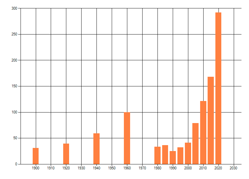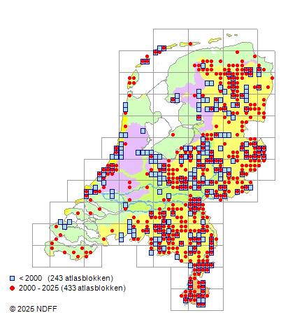 Het aantal atlasblokken (5x5 km) waarin de soort is gemeld binnen een periode van vijf jaar (vanaf 1980) of twintig jaar. Niet gecorrigeerd voor waarnemersinspanning en het aantal doorgegeven waarnemingen kan sterk variëren per periode, dus een trend in verspreiding kan hier niet direct uit worden afgelezen. Het opgegeven jaartal is het eerste jaar van de periode. Bron: gevalideerde waarnemingen uit de NDFF.