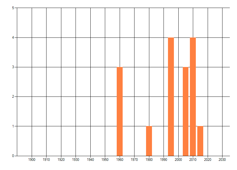 Het aantal atlasblokken (5x5 km) waarin de soort is gemeld binnen een periode van vijf jaar (vanaf 1980) of twintig jaar. Niet gecorrigeerd voor waarnemersinspanning en het aantal doorgegeven waarnemingen kan sterk variëren per periode, dus een trend in verspreiding kan hier niet direct uit worden afgelezen. Het opgegeven jaartal is het eerste jaar van de periode. Bron: gevalideerde waarnemingen uit de NDFF.