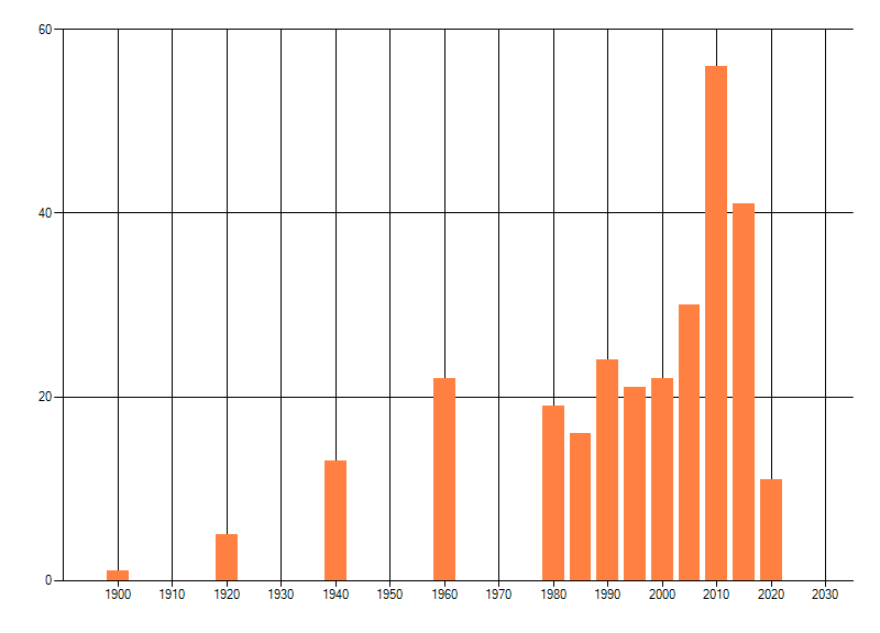 Het aantal atlasblokken (5x5 km) waarin de soort is gemeld binnen een periode van vijf jaar (vanaf 1980) of twintig jaar. Niet gecorrigeerd voor waarnemersinspanning en het aantal doorgegeven waarnemingen kan sterk variëren per periode, dus een trend in verspreiding kan hier niet direct uit worden afgelezen. Het opgegeven jaartal is het eerste jaar van de periode. Bron: gevalideerde waarnemingen uit de NDFF.