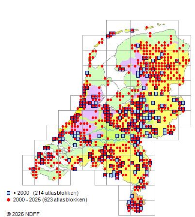 Het aantal atlasblokken (5x5 km) waarin de soort is gemeld binnen een periode van vijf jaar (vanaf 1980) of twintig jaar. Niet gecorrigeerd voor waarnemersinspanning en het aantal doorgegeven waarnemingen kan sterk variëren per periode, dus een trend in verspreiding kan hier niet direct uit worden afgelezen. Het opgegeven jaartal is het eerste jaar van de periode. Bron: gevalideerde waarnemingen uit de NDFF.