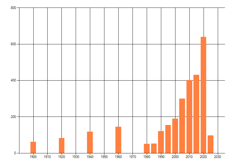 Het aantal atlasblokken (5x5 km) waarin de soort is gemeld binnen een periode van vijf jaar (vanaf 1980) of twintig jaar. Niet gecorrigeerd voor waarnemersinspanning en het aantal doorgegeven waarnemingen kan sterk variëren per periode, dus een trend in verspreiding kan hier niet direct uit worden afgelezen. Het opgegeven jaartal is het eerste jaar van de periode. Bron: gevalideerde waarnemingen uit de NDFF.