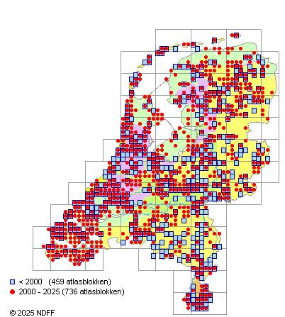 Het aantal atlasblokken (5x5 km) waarin de soort is gemeld binnen een periode van vijf jaar (vanaf 1980) of twintig jaar. Niet gecorrigeerd voor waarnemersinspanning en het aantal doorgegeven waarnemingen kan sterk variëren per periode, dus een trend in verspreiding kan hier niet direct uit worden afgelezen. Het opgegeven jaartal is het eerste jaar van de periode. Bron: gevalideerde waarnemingen uit de NDFF.