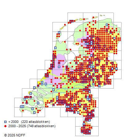 Het aantal atlasblokken (5x5 km) waarin de soort is gemeld binnen een periode van vijf jaar (vanaf 1980) of twintig jaar. Niet gecorrigeerd voor waarnemersinspanning en het aantal doorgegeven waarnemingen kan sterk variëren per periode, dus een trend in verspreiding kan hier niet direct uit worden afgelezen. Het opgegeven jaartal is het eerste jaar van de periode. Bron: gevalideerde waarnemingen uit de NDFF.