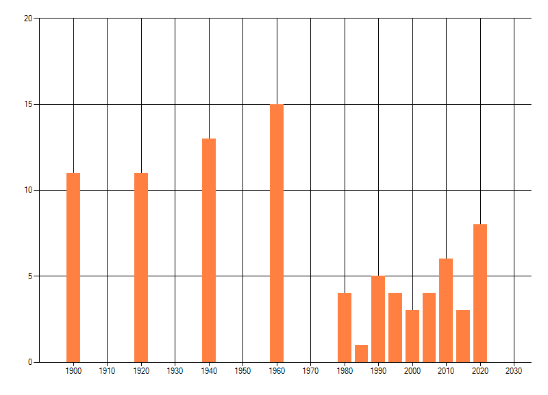 Het aantal atlasblokken (5x5 km) waarin de soort is gemeld binnen een periode van vijf jaar (vanaf 1980) of twintig jaar. Niet gecorrigeerd voor waarnemersinspanning en het aantal doorgegeven waarnemingen kan sterk variëren per periode, dus een trend in verspreiding kan hier niet direct uit worden afgelezen. Het opgegeven jaartal is het eerste jaar van de periode. Bron: gevalideerde waarnemingen uit de NDFF.