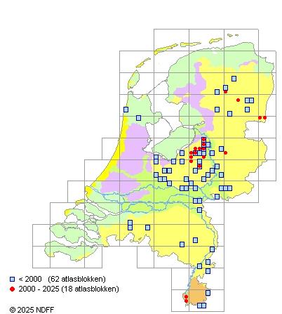 Zeldzaam. Wordt zeer verspreid over het land waargenomen, vooral op de zandgronden. RL: ernstig bedreigd.