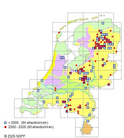 Het aantal atlasblokken (5x5 km) waarin de soort is gemeld binnen een periode van vijf jaar (vanaf 1980) of twintig jaar. Niet gecorrigeerd voor waarnemersinspanning en het aantal doorgegeven waarnemingen kan sterk variëren per periode, dus een trend in verspreiding kan hier niet direct uit worden afgelezen. Het opgegeven jaartal is het eerste jaar van de periode. Bron: gevalideerde waarnemingen uit de NDFF.