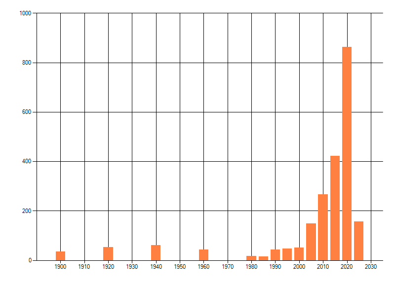 Het aantal atlasblokken (5x5 km) waarin de soort is gemeld binnen een periode van vijf jaar (vanaf 1980) of twintig jaar. Niet gecorrigeerd voor waarnemersinspanning en het aantal doorgegeven waarnemingen kan sterk variëren per periode, dus een trend in verspreiding kan hier niet direct uit worden afgelezen. Het opgegeven jaartal is het eerste jaar van de periode. Bron: gevalideerde waarnemingen uit de NDFF.