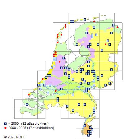 Het aantal atlasblokken (5x5 km) waarin de soort is gemeld binnen een periode van vijf jaar (vanaf 1980) of twintig jaar. Niet gecorrigeerd voor waarnemersinspanning en het aantal doorgegeven waarnemingen kan sterk variëren per periode, dus een trend in verspreiding kan hier niet direct uit worden afgelezen. Het opgegeven jaartal is het eerste jaar van de periode. Bron: gevalideerde waarnemingen uit de NDFF.