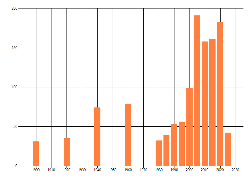 Het aantal atlasblokken (5x5 km) waarin de soort is gemeld binnen een periode van vijf jaar (vanaf 1980) of twintig jaar. Niet gecorrigeerd voor waarnemersinspanning en het aantal doorgegeven waarnemingen kan sterk variëren per periode, dus een trend in verspreiding kan hier niet direct uit worden afgelezen. Het opgegeven jaartal is het eerste jaar van de periode. Bron: gevalideerde waarnemingen uit de NDFF.