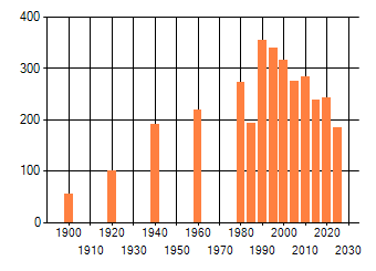 Het aantal atlasblokken (5x5 km) waarin de soort is gemeld binnen een periode van vijf jaar (vanaf 1980) of twintig jaar.