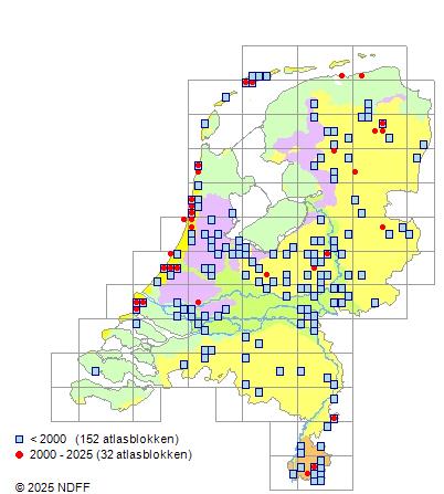 Het aantal atlasblokken (5x5 km) waarin de soort is gemeld binnen een periode van vijf jaar (vanaf 1980) of twintig jaar. Niet gecorrigeerd voor waarnemersinspanning en het aantal doorgegeven waarnemingen kan sterk variëren per periode, dus een trend in verspreiding kan hier niet direct uit worden afgelezen. Het opgegeven jaartal is het eerste jaar van de periode. Bron: gevalideerde waarnemingen uit de NDFF.
