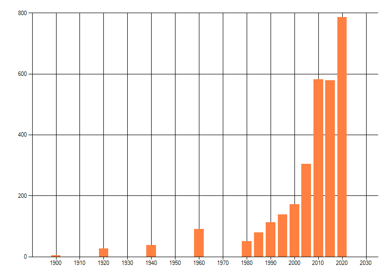 Het aantal atlasblokken (5x5 km) waarin de soort is gemeld binnen een periode van vijf jaar (vanaf 1980) of twintig jaar. Niet gecorrigeerd voor waarnemersinspanning en het aantal doorgegeven waarnemingen kan sterk variëren per periode, dus een trend in verspreiding kan hier niet direct uit worden afgelezen. Het opgegeven jaartal is het eerste jaar van de periode. Bron: gevalideerde waarnemingen uit de NDFF.
