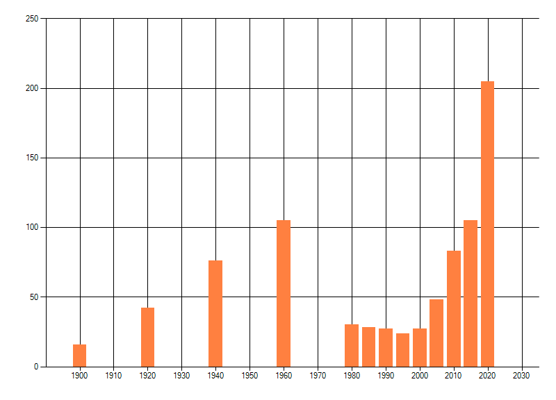 Het aantal atlasblokken (5x5 km) waarin de soort is gemeld binnen een periode van vijf jaar (vanaf 1980) of twintig jaar. Niet gecorrigeerd voor waarnemersinspanning en het aantal doorgegeven waarnemingen kan sterk variëren per periode, dus een trend in verspreiding kan hier niet direct uit worden afgelezen. Het opgegeven jaartal is het eerste jaar van de periode. Bron: gevalideerde waarnemingen uit de NDFF.