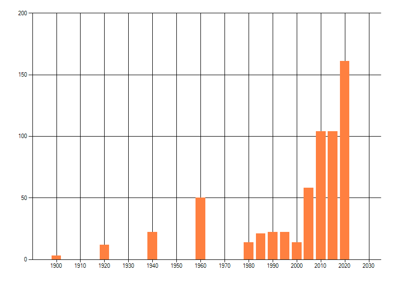 Het aantal atlasblokken (5x5 km) waarin de soort is gemeld binnen een periode van vijf jaar (vanaf 1980) of twintig jaar. Niet gecorrigeerd voor waarnemersinspanning en het aantal doorgegeven waarnemingen kan sterk variëren per periode, dus een trend in verspreiding kan hier niet direct uit worden afgelezen. Het opgegeven jaartal is het eerste jaar van de periode. Bron: gevalideerde waarnemingen uit de NDFF.