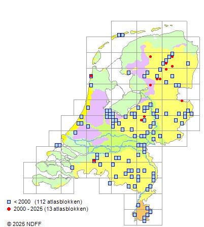Het aantal atlasblokken (5x5 km) waarin de soort is gemeld binnen een periode van vijf jaar (vanaf 1980) of twintig jaar. Niet gecorrigeerd voor waarnemersinspanning en het aantal doorgegeven waarnemingen kan sterk variëren per periode, dus een trend in verspreiding kan hier niet direct uit worden afgelezen. Het opgegeven jaartal is het eerste jaar van de periode. Bron: gevalideerde waarnemingen uit de NDFF.