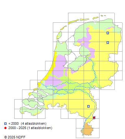 Het aantal atlasblokken (5x5 km) waarin de soort is gemeld binnen een periode van vijf jaar (vanaf 1980) of twintig jaar. Niet gecorrigeerd voor waarnemersinspanning en het aantal doorgegeven waarnemingen kan sterk variëren per periode, dus een trend in verspreiding kan hier niet direct uit worden afgelezen. Het opgegeven jaartal is het eerste jaar van de periode. Bron: gevalideerde waarnemingen uit de NDFF.